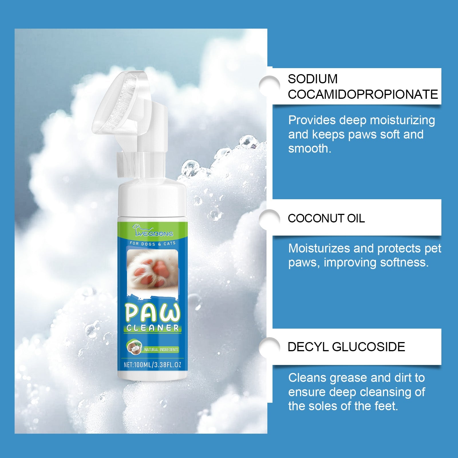 Our pet foot cleaner contains sodium cocaminopropionate and decyl glucoside. It can deep clean your pet's PAWS using safe and gentle ingredients, ensuring that the cleaning process is non-irritating. Easy to operate, gentle pressure produces a rich and delicate foam that can quickly remove dirt from your pet's PAWS. The way to use it is simple: remove the lid and squeeze out the right amount of foam, gently brush your pet's PAWS with a soft silicone brush, and rinse thoroughly with clean water. It is also rich in moisturizing ingredients that moisturize PAWS, prevent dryness and cracking, and provide gentle protection.