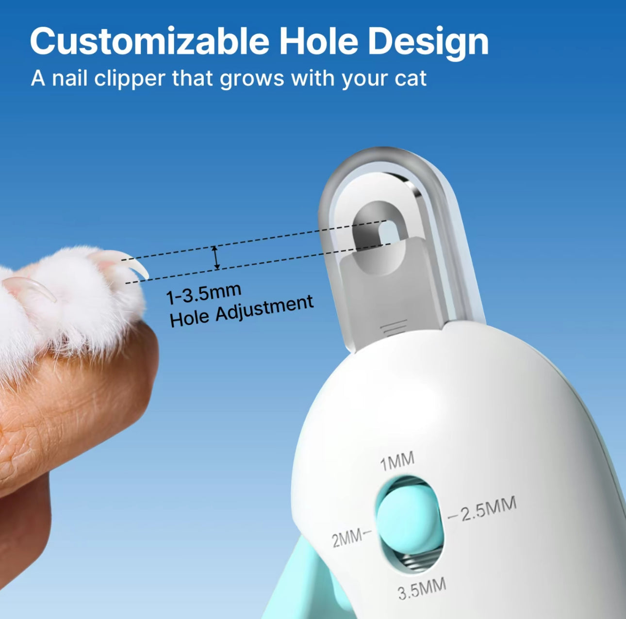 Features a single round trimming hole with 4 adjustable diameters (1–3.5mm) to safely trim small kitten claws or larger indoor cat nails. No blade swapping required — just precise, easy grooming. -