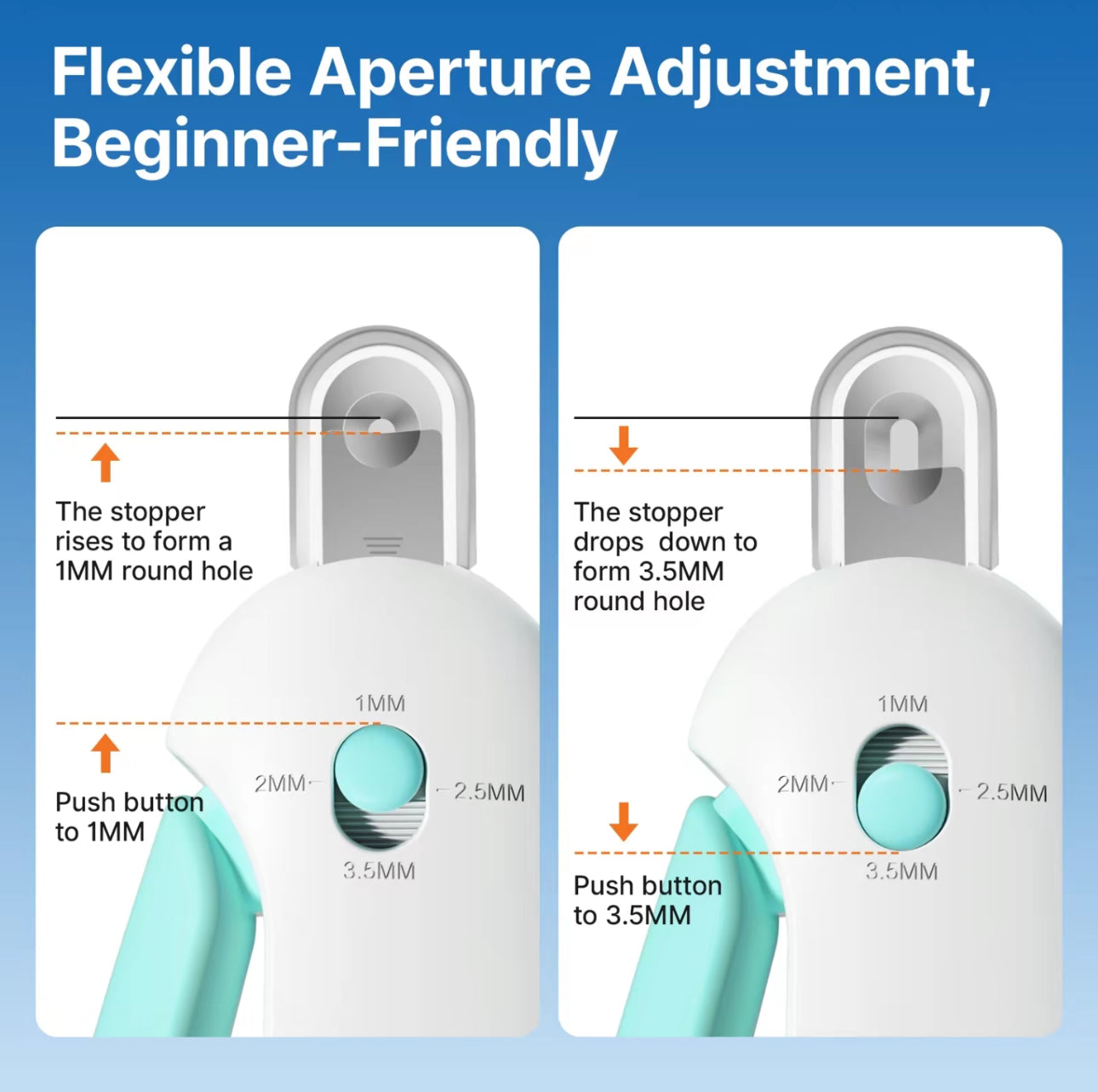 The blind trimming design helps prevent cutting into the quick. Ideal for beginners or nervous pet parents, the adjustable hole gives you full control for gentle, worry-free claw care. -