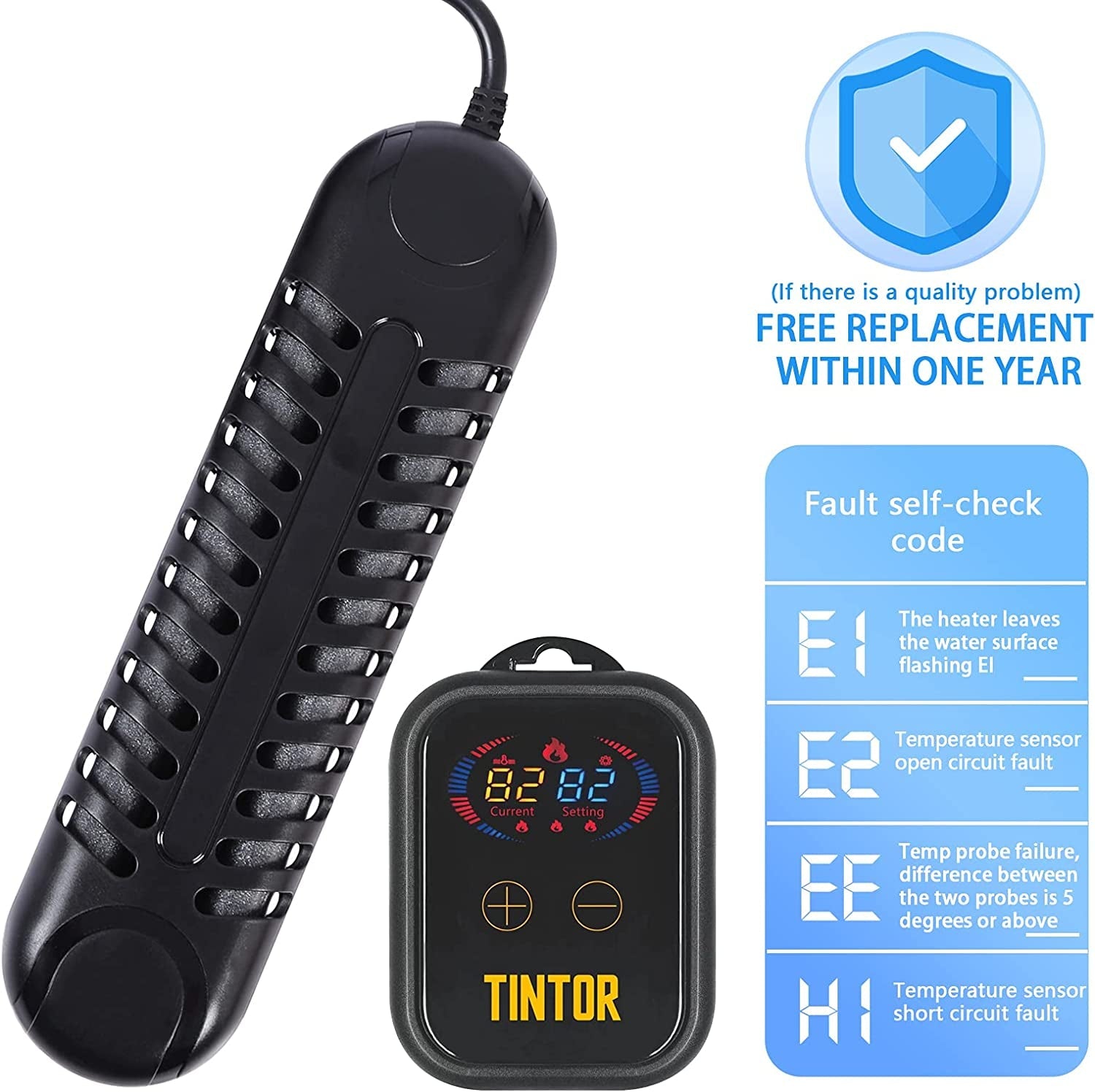 Welcome to Tintor. Tintor is a professiol store specializing in aquatic products and accessories. We are committed to providing customers with quality products and better services. We have 24-hour customer service, covering pre- s and after- s services. If you have any questions, please feel free to contact us. Product Name : Tintor Aquarium Diving Heater Specifications : 1200W Voltage : 110V / 60Hz Product Size 800w/1200w : 12.04in3.07in Power cord length : 4ft+5.9ft Controller : Exterl LED digital temperature controller (not waterproof) Temperature accuracy: ±1 Degree F Package includes : 1 × heater with exterl controller; 1 × user manual; 4 suction cups Why choose Tintor aquarium heater for your fish tank? 1. It is safe to use. When the water temperature exceeds 95 Degree F, the digital aquarium heater will automatically turn off. When the top of the heater exceeds 0.8 inches, the aquarium heater will automatically turn off. 2. It is non-explosive, with high temperature resistant and plastic shield, and the heating element is high-quality and durable quartz tube, which can be used for fresh water and salt water. 3. Energy saving, built-in PID chip, compared with ordiry aquarium heater, energy saving up to 30 Percent . 4. Digital display, you can check the water temperature at any time and set the temperature on the controller. It is easy to set the temperature. There is only one setting button on the controller, and the temperature can be selected from 68 Degree F to 93 Degree F by pressing this button. Warm Reminder In the process of using the heater, in order to make the temperature of the fish tank uniform, please be sure to use it in conjunction with the circulating water pump. If you have any questions, please contact us, I wish you a happy shopping. Quality Assurance This product is for one year. In the process of using the product, if there is any dissatisfaction, please contact our aft